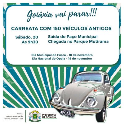 A Agência Municipal de Turismo, Eventos e Lazer (Agetul) celebra no próximo sábado, 20, às 9h30, o Dia Municipal do Fusca com uma grande carreata de carros antigos, que terá saída no Paço Municipal e percorrerá por várias vias da capital. A carreata é organizada pelo Clube do Opala de Goiânia (Opalagyn) e pela Associação dos Proprietários de Carros Antigos (Apcar), com o apoio da Prefeitura de Goiânia.