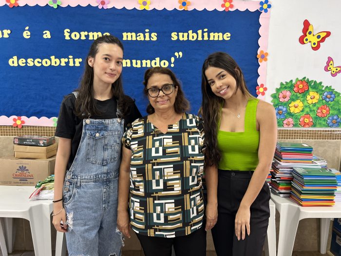 A EBM Desenvolvimento Imobiliário realizou, nesta semana, a entrega de dois mil materiais escolares para o Centro de Educação Dona Filhinha, creche no setor Madre Germana I, em Aparecida de Goiânia, que se dedica a prestar cuidados e capacitar crianças em situação de vulnerabilidade. Os materiais foram arrecadados pelo Pilar Social, projeto por meio do qual a incorporadora se dedica a prestar assistência social a instituições da capital e da região metropolitana. Os donativos foram coletados durante o Natal Encantado da EBM, em 2022, e a quantidade de itens foi dobrada pela empresa antes da entrega à instituição. Na foto, a diretora da Creche Dona Filhinha, Wanderlúcia Salazar (ao centro), e as representantes da EBM, Rafaela de Almeida e Alice Marinho. Foto: Divulgação.
