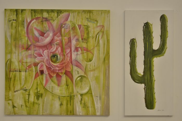 “A pintura da paisagem (foto), que permite o olhar tradicional de se deleitar no lirismo da obra, questiona a influência do movimento impressionista de Monet, nos dias atuais. Outra reflexão interessante é demonstrada na instalação com garrafas e livros, bem ao centro da exposição que aborda a importância do conhecimento”, detalha Fernanda.