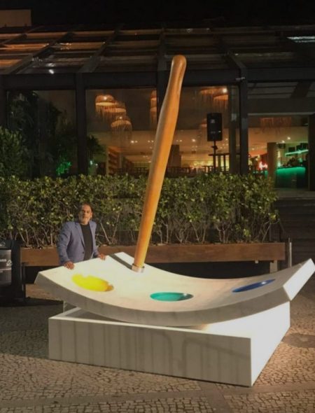O artista Jaildo Marinho com a obra de sua autoria, “Jangada”
