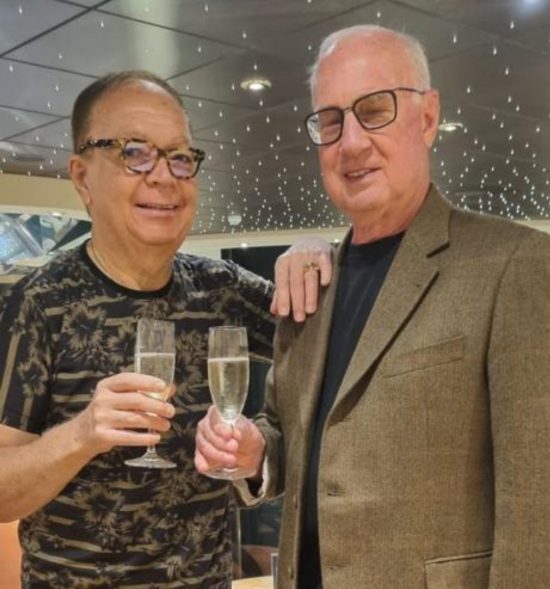 Odontólogo Magno Pinheiro e Cláudio Valente, brindando o aniversário de Magno, no último dia 05, num Cruzeiro de Santos a Buenos Aires.