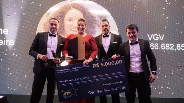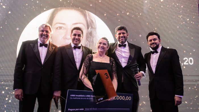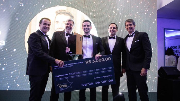 A corretora vencedora parceira URBS Opportunity 3º lugar, Ivany Moreira (ao centro, com o troféu), acompanhada do sócio-proprietário Ricardo Teixeira e diretor Thiago Rocha (à esq.) e do sócio-diretor Edmilson Borges e diretor Kassio Oliveira (à dir.).