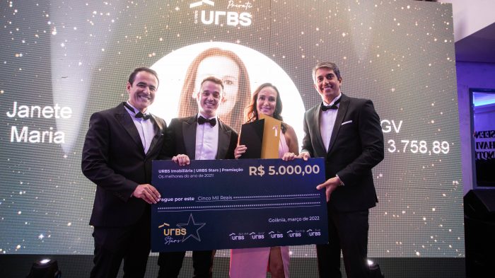 A corretora vencedora parceira URBS One 1º lugar, Jane Oliveira (ao centro), recebeu sua premiação das mãos do sócio-diretor Juliano Junqueira (à esq.), do diretor Francisco Eduardo e do diretor Jorge Augusto Félix (à dir.).