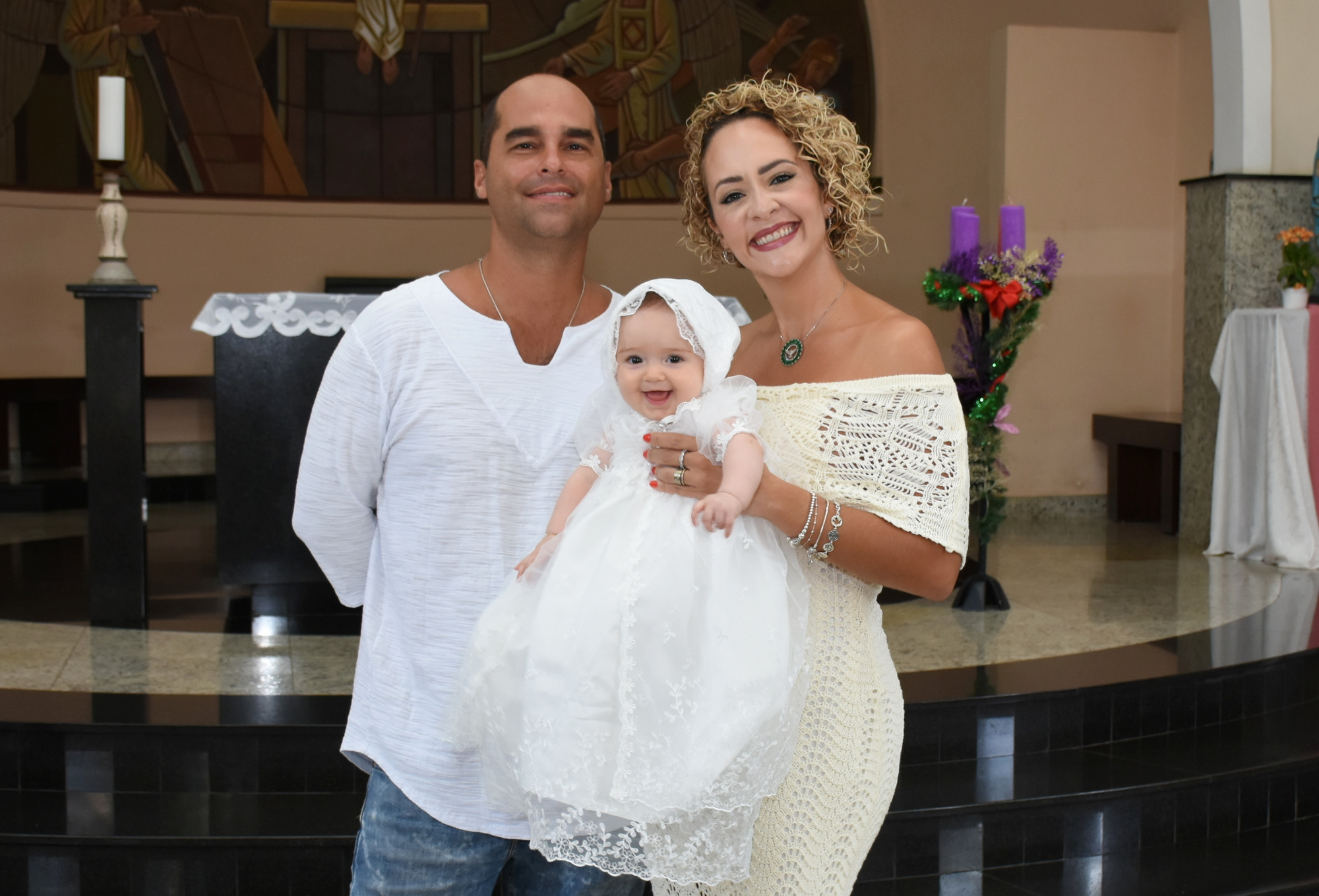 A pequena Elena Delai Fonseca recebeu água benta nos braços dos padrinhos Mariana Fonseca e Franco Matos Rocha, em celebração na Paróquia Cristo Ressuscitado. Foto de Luciana Lombardi.