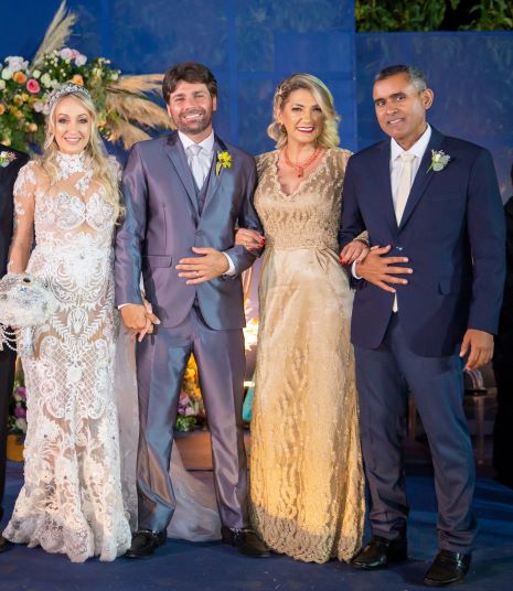 Elisângela Goldinho e Carlos Eduardo Aires Ávila casaram-se em cerimônia e recepção no Spazio Vital Eventos, com o testemunho dos amigos Soraya Pamplona e Francisco Costa, com eles na foto.