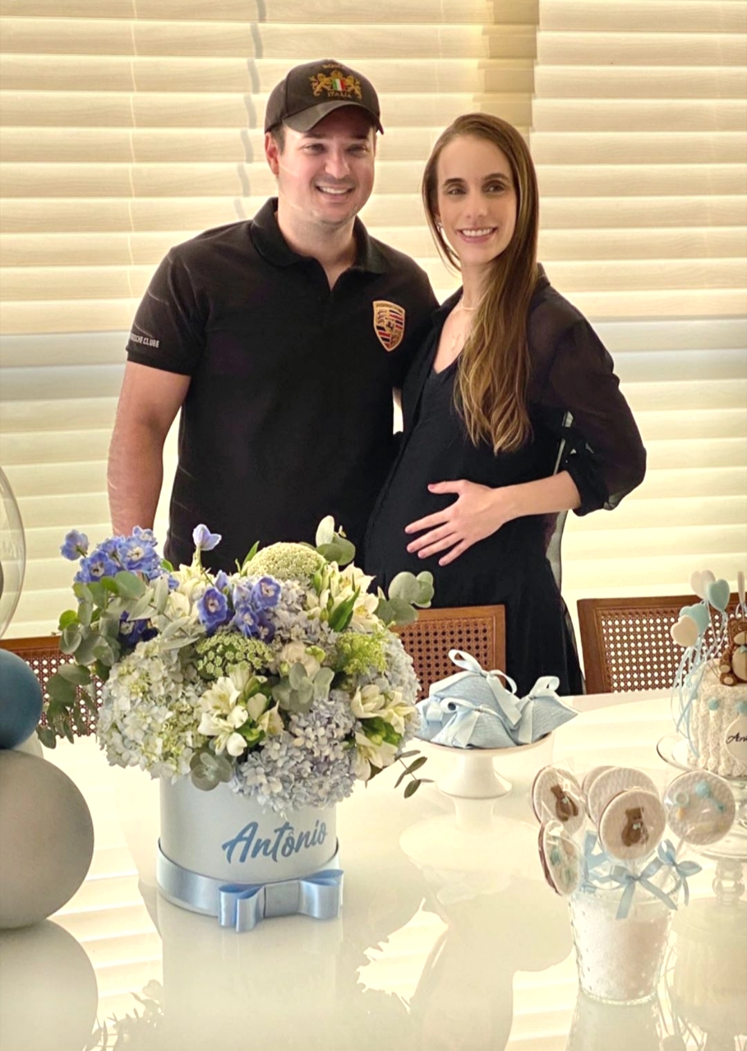 O cirurgião plástico Dhyego Curado e a radiologista Fernanda Calixto Abdala estão a espera, para este mês, do primeiro filho. No último sábado, foram surpreendidos com o novo modelo de chá de bebê, em drive thru, organizado por um grupo de amigos, em frente o seu apartamento no Setor Marista.