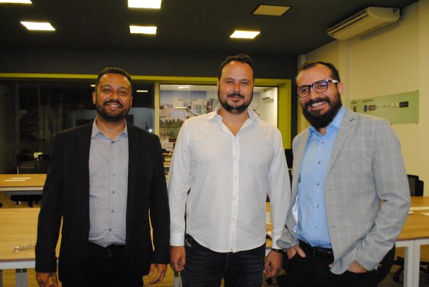 Os empresários Marcos Bernardo (centro) e Deybson Santana (à direita) receberam o vice-presidente da Softex, Diones Lima, que anunciou uma série de cursos direcionados à preparação de profissionais e empresas para a transformação digital, no Hub Gyntec