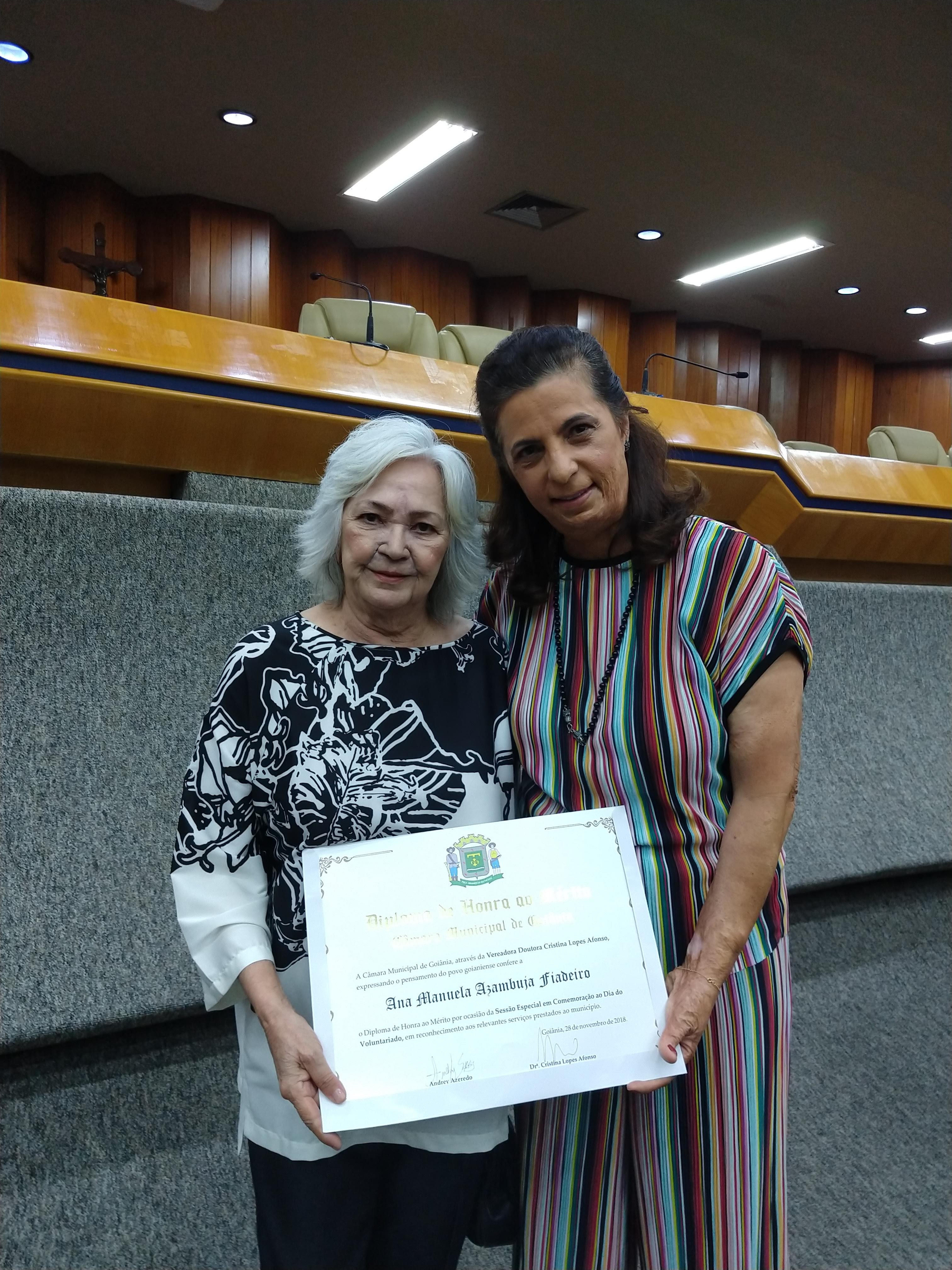 A jornalista Ana Manuela Fiadeiro, editora da revista People, recebeu homenagem na Câmara Municipal de Goiânia a propósito Dia do Voluntariado. A vereadora Cristina Lopes, foi autora da propositura