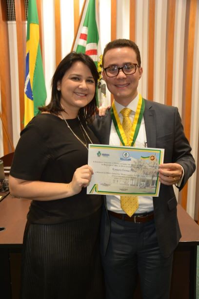 O advogado criminalista Romero Ferraz Filho compartilha com sua Marcela o momento feliz em que recebeu a Medalha do Mérito Legislativo Pedro Ludovico, em sessão solene segunda-feira na Assembleia Legislativa.