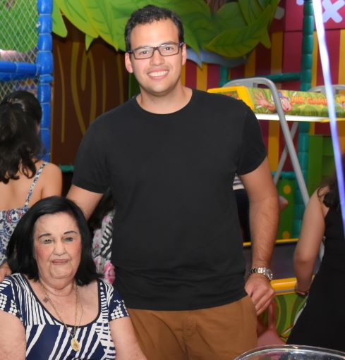 Guaracy Lôbo com o neto Rogério Las Casas, médico, ajudou a receber os convidados da festa do bisneto Mateus Esselyn Freire