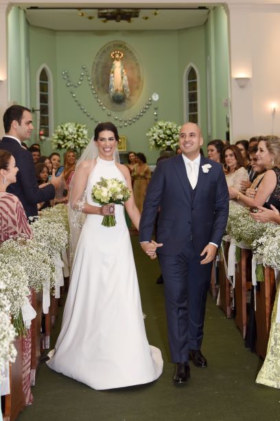 A noiva estava linda num vestido de cetim de seda pura criado pelo estilista Cristiano Bernardes e, em lance emocionante, levava junto com o buquê uma foto do pai Dilson Gouveia, falecido neste ano. Ao pé do altar foi recebida por sua mãe Miriam Rodrigues Gouveia, onde já estavam os pais do noivo, Ivana de Castro Carneiro Tomé Oliveira-Gabriel José Benedito de Oliveira.